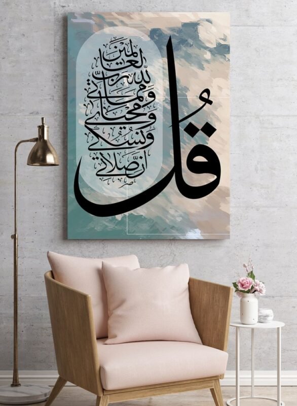 يوفر لك متجرنا لوحة جدارية اسلامية رائعة بتصميم إسلامي قل إن صلاتي ونسكي ومحياي ومماتي لله رب العالمين. تتميز اللوحة بتصميمها الجميل بحيث توجد كلمة قل على الجانب الأيمن ويوجد بداخلها باقي الآية الكريمة.